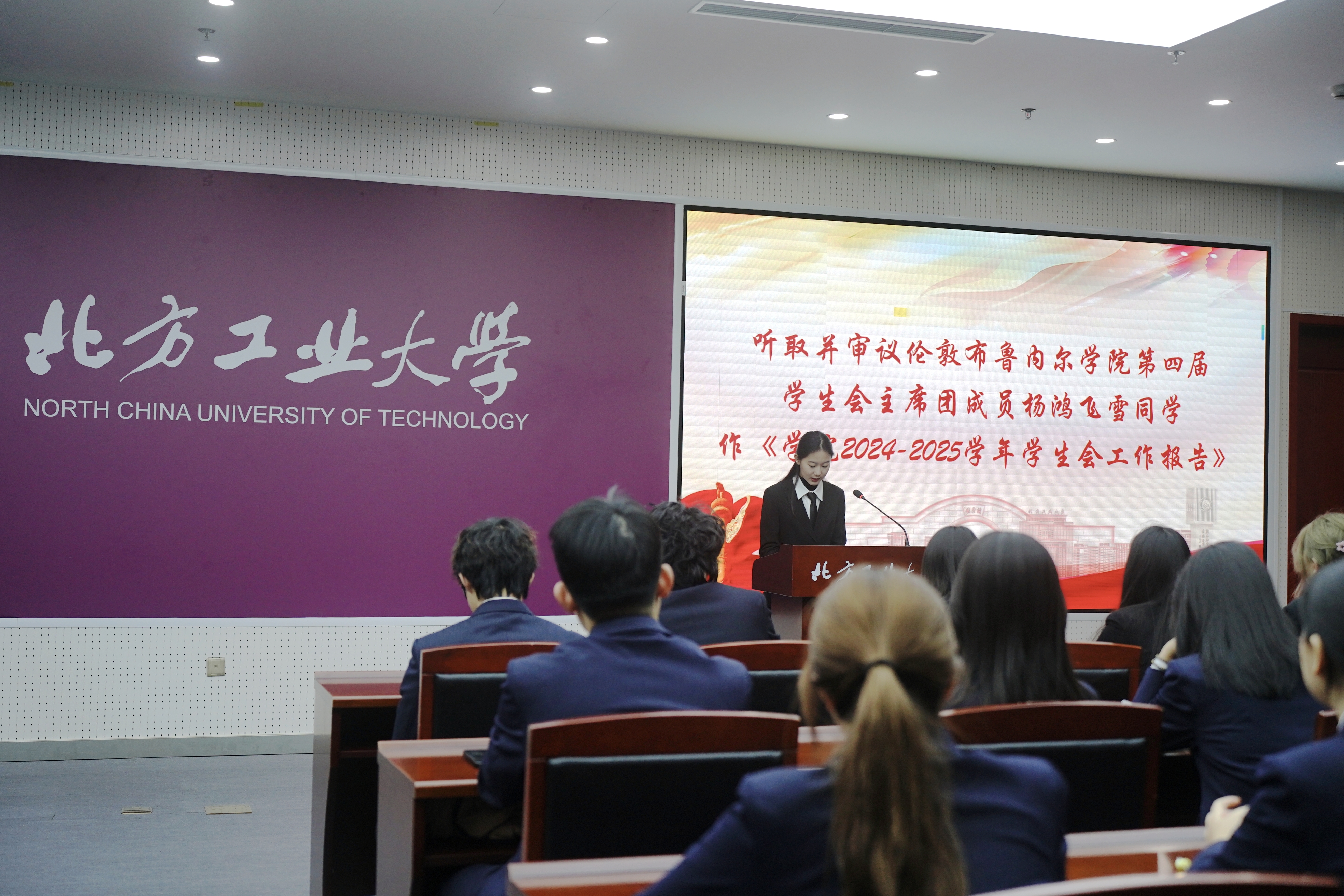 第四届学生会主席团成员杨鸿飞雪代表学生会向大会作了工作报告,报告中总结了过去一年的工作,并对接下来的工作进行规划。